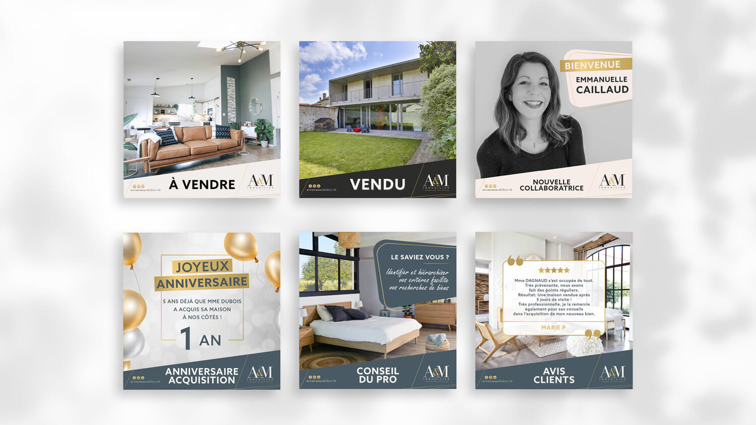 Virginie Dagnaud, conseillère en immobilier et fondatrice d’A&M Immobilier,  un concept hybride entre l’agence traditionnelle et le réseau de mandataires, a choisi de confier la création de son identité et la gestion de sa communication globale à l’agence Encore. Entre Virginie Dagnaud et l’agence, c’est une réelle relation de confiance qui s’est construite et qui se renouvelle depuis quelques années.